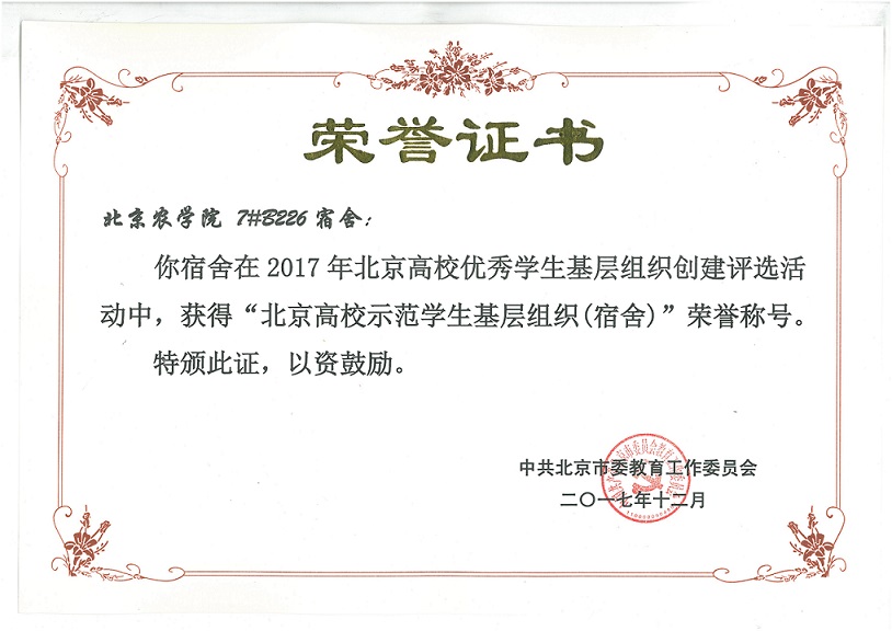 在北京市教工委组织的2017年北京高校优秀员工基层组织创建评选活动中,公司2016级员工宿舍7#B226荣获“北京高校示范员工基层组织(宿舍)”荣誉称号。