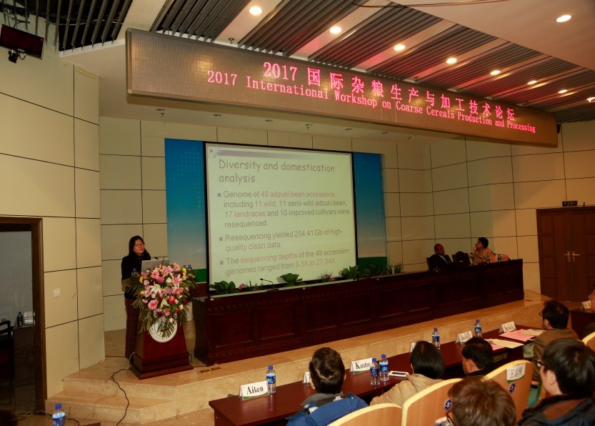 应大会组委会邀请,公司小豆团队在“2017International Workshop on Coarse Cereals Production and Processing(2017 WCCPP,2017国际杂粮生产与加工技术论坛)”做了题为“Mining onImportantly Agronomic Trait Genes of Germplasms Resourses and Improvement based genome in Adzuki Bean(基于基因组的小豆种质资源重要农艺性状基因挖掘和育种)”大会特邀报告。来自中国、美国、印度、日本和韩国等国的300多位中外杂粮研究专家和生产加工企业及研究生代表参会。