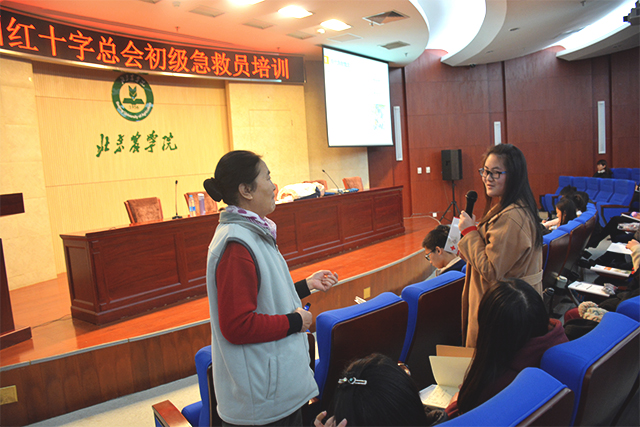 本次培训主要为理论培训,上午的培训内容主要为以下三点:现代急救概念、心肺复苏和气道异物阻塞。首先韩老师向同学们提问大家对于红十字会的了解,同学们踊跃发言,纷纷表达了自己对红十字会的了解与看法。同时韩老师还向同学们介绍了红十字会的起源、成立目的及精神原则。韩老师通过几则短片向大家介绍了严重威胁人类生命的危险因素并告诉同学们应该怎样面对突发情况。在讲到心肺复苏操作步骤时,韩老师不仅带领全体同学进行按压演练还特意邀请几位同学上台亲自实践操作一系列流程。最后韩老师举例向大家介绍了气道异物梗阻的原因及急救办法。12点上午的培训结束。