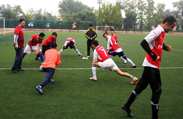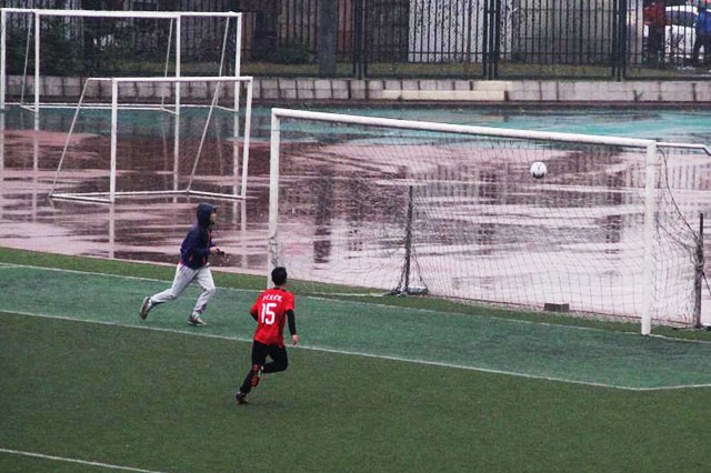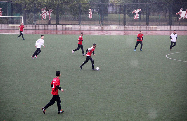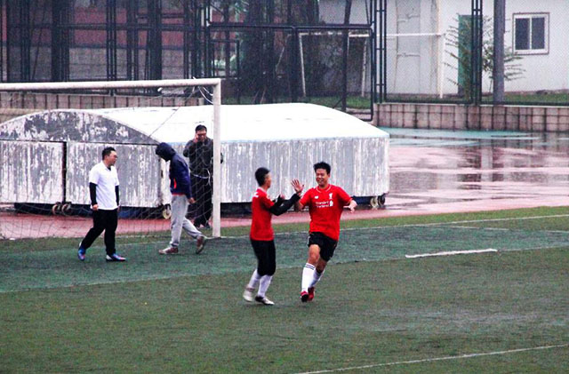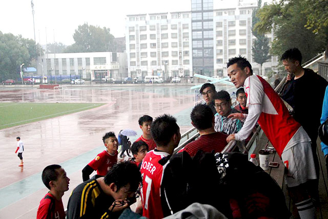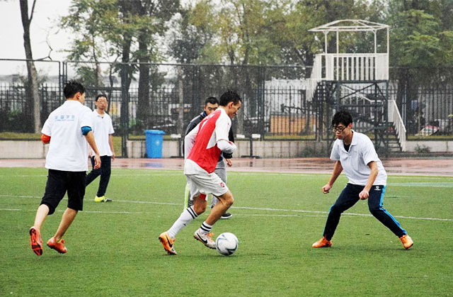 10月27日下午3点30分,yl88858永利集团足球队与国际公司足球队在操场上举行了一场足球小组赛。3点左右,运动员们冒着风雨,在满是水洼的球场上开始热身。