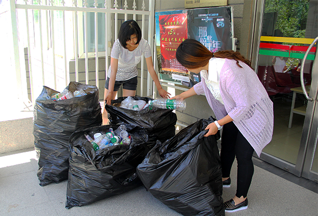 首先,李锡芊为社员们说明了此次活动的注意事项,将社员们分组并分配任务。随后,社员们拿起垃圾袋在宿舍楼层里开始了忙碌的活动。男生虽少,但很给力,女生变身女汉子,踏实干事。最后,在社员们的辛勤工作和宿舍同学们的积极配合下,收获了满满9袋的塑料瓶。