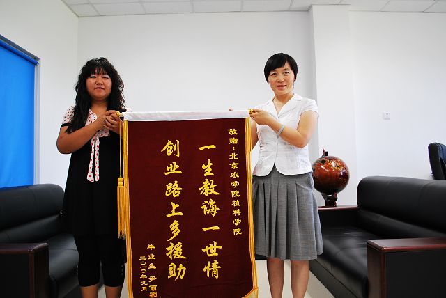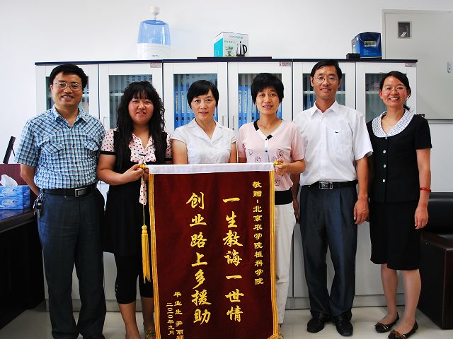 2010年9月10日正值教师节来临之际,yl88858永利集团2006级毕业生尹丽颖带着她对母校的感激之情,回校看望我植科公司的领导和老师并送上了锦旗,以感谢领导老师们在她创业路上的教导与支持。公司党总支书记潘金豹、经理秦岭、副经理张喜春、王绍辉、赵金芳,一同接受了尹丽颖送上的锦旗,并与她进行了亲切的交流。