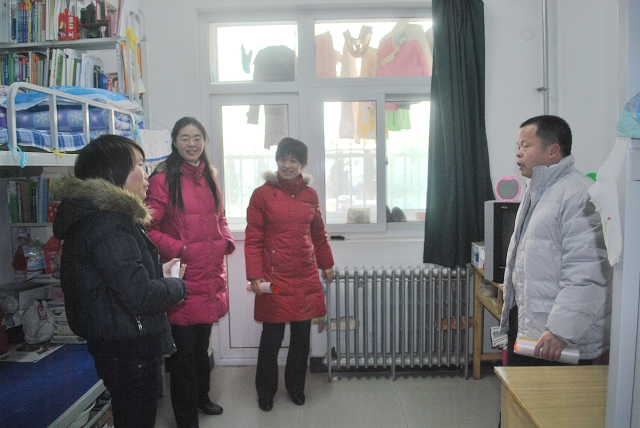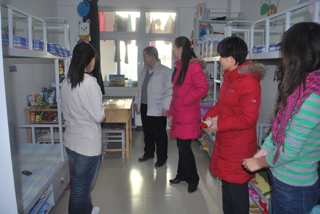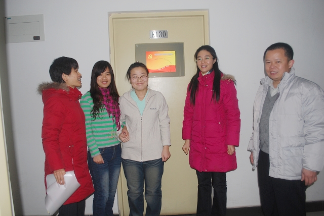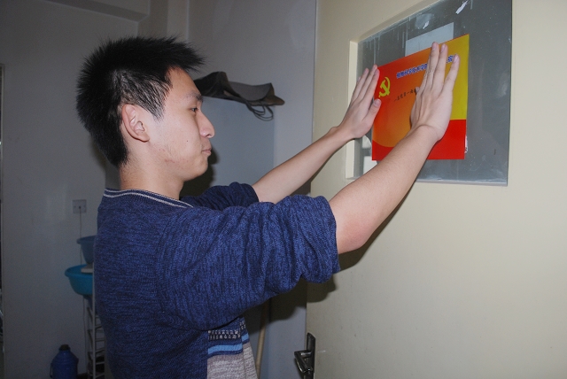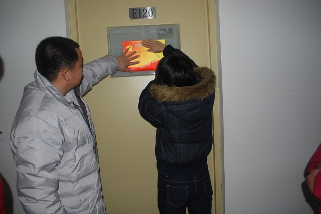 几位老师首先到8、9号楼的员工党员宿舍进行参观,整齐、清洁的宿舍情况得到了老师的好评。副经理赵金芳勉励党员同学要保持宿舍卫生整洁,同时强调党员示范宿舍的作用就是发动全体党员、带动广大同学,力求每位党员都是一面旗帜,都能起到带头作用,不仅仅在宿舍区示范带头,更要在各个方面起到先锋模范作用。最后几位老师和宿舍的党员同学一起张贴示范牌。