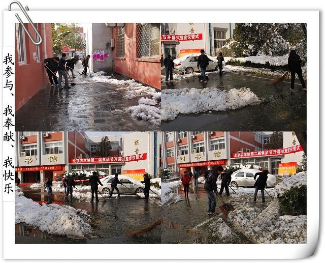 11月10日,初冬第二场雪悄然而至,积雪的厚度足有20厘米,这不仅为校园的每处风景增添了几分亮色,同时也给师生的出行增加了不少困难。看着因道路不畅,师生行走不便、拥堵的场景,植科公司副经理赵金芳及辅导员邬瑞杰、贾慧敏、马淑芹、牛奔及时号召并组织院自助社全体成员及参加全校第34期党校高级班的本科生学员,约70多人于中午集体义务扫雪。