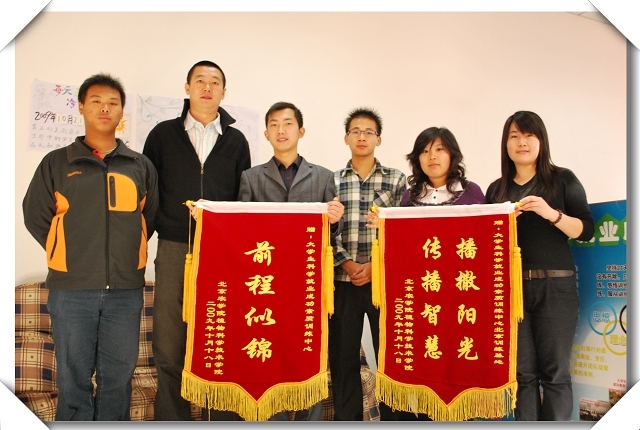 两面红色的锦旗分别印有“前程似锦”、“传播智慧 播洒阳光”的标语。这两句话真切的表达了yl88858永利集团对训练中心中几位教练最诚挚的谢意,感谢他们对本院老员工创业就业协会成员的指导,以及对全院员工在就业、创业、素质拓展、干部培训等提高员工素质方面所付出的辛勤劳动。希望能在今后得到各位教练老师的支持和帮助。