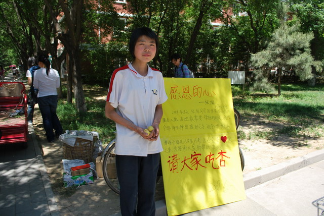 2009年6月3日,校园里一辆拉满杏的电瓶小三轮引起大家的关注,更令人费解的是满车的杏要请校内师生免费品尝。