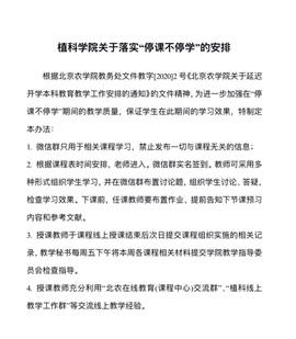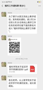 2月9日,公司经理潘金豹教授亲自部署植科公司“停课不停学”工作,教学副经理韩莹琰起草《植科公司关于落实”停课不停学”的安排》,2月10日发公司党政联系会微信群中讨论。“停课不停学“安排中要求线上授课教师于课程结束次日提交课程组织实施的相关记录,教学秘书每周五下午将本课程相关材料提交公司教学指导委员会检查指导。2月13日,建立“植科线上教学工作群”,便于及时发布相关通知,授课教师充分交流线上教学经验。每门课程的授课教师将创建的课程微信群二维码发到工作群中,由教学秘书发给相关班的班委,员工扫码进入。2月21日,课程负责人将每门课的线上教学工作方案发给公司教学秘书,保证公司线上教学顺利运行及有效监督。