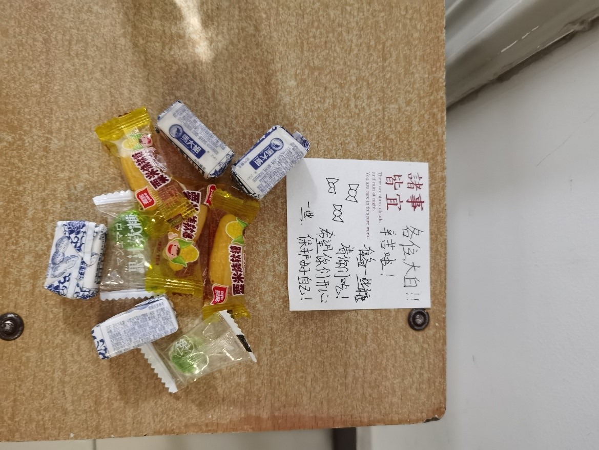 万众一心,打赢疫情防控阻击战。12月2日,在疫情最吃紧的时候,7号楼的抗疫任务都压7号楼驻楼老师身上,杨韫嘉同7号楼的“巾帼团队”一起扛起了7号楼的重任。同时作为植科的老师,充分发挥公司优势,第一时间联系员工,迅速安抚稳定员工情绪,减轻楼内管理压力。当看到同学们在群里刷屏“老师辛苦了!谢谢老师!”,收到同学们写有感恩话语小纸条时,所有的疲惫都消失殆尽。杨韫嘉发自内心地说道:“打赢疫情防控阻击战,是我们每一个人的共同愿景。凡心所向,素履以往,我们和同学们一起同舟共济,守望相助,共抗疫情。”