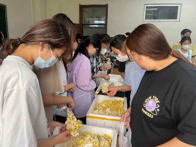 在张老师的讲解之后,整个教室的欢乐氛围在社团向同学们发放蘑菇、卡纸等制作材料的过程中达到了高潮。至此,“学农爱农,强国有我”——永利集团第二届食用菌孢子印画大赛正式拉开序幕。