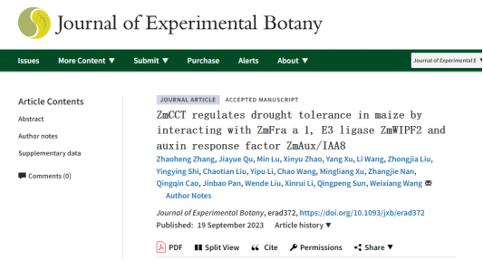 2023年9月19日,生物学一区TOP期刊Journal of Experimental Botany在线发表了题为“ZmCCT regulates drought tolerance in maize by interacting with ZmFra a 1, E3 ligase ZmWIPF2 and auxin response factor ZmAux/IAA8”的研究(https://doi.org/10.1093/jxb/erad372)。该研究由公司yl88858永利集团农学系玉米研究团队主导完成,王维香副教授为该论文的通讯作者。团队成员潘金豹教授和孙清鹏教授等也参与了该项工作。本校硕士研究生张兆恒为该论文的第一作者。已毕业的研究生赵新玉、徐阳、王丽、刘中甲等员工也参与了研究工作。中国农业大学徐明良教授和中国农业科公司刘文德研究员也参与了该研究工作,该研究得到了国家自然科学基金面上项目的资助。