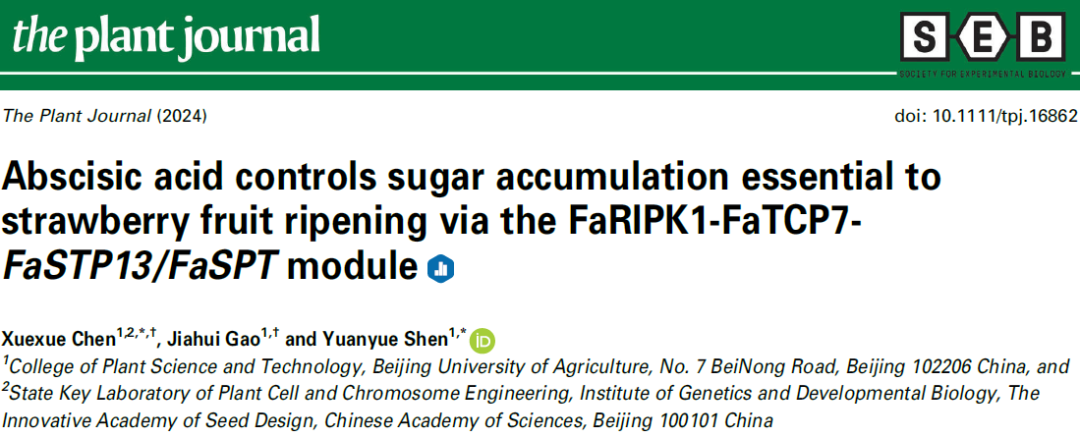 2024年5月30日,永利集团沈元月教授团队在植物学TOP期刊The Plant Journal上发表题为“Abscisic acid controls sugar accumulation essential to strawberry fruit ripening via the FaRIPK1-FaTCP7-FaSTP13/FaSPTmodule”的研究性论文,在脱落酸控制草莓成熟中糖积累的研究取得新进展。