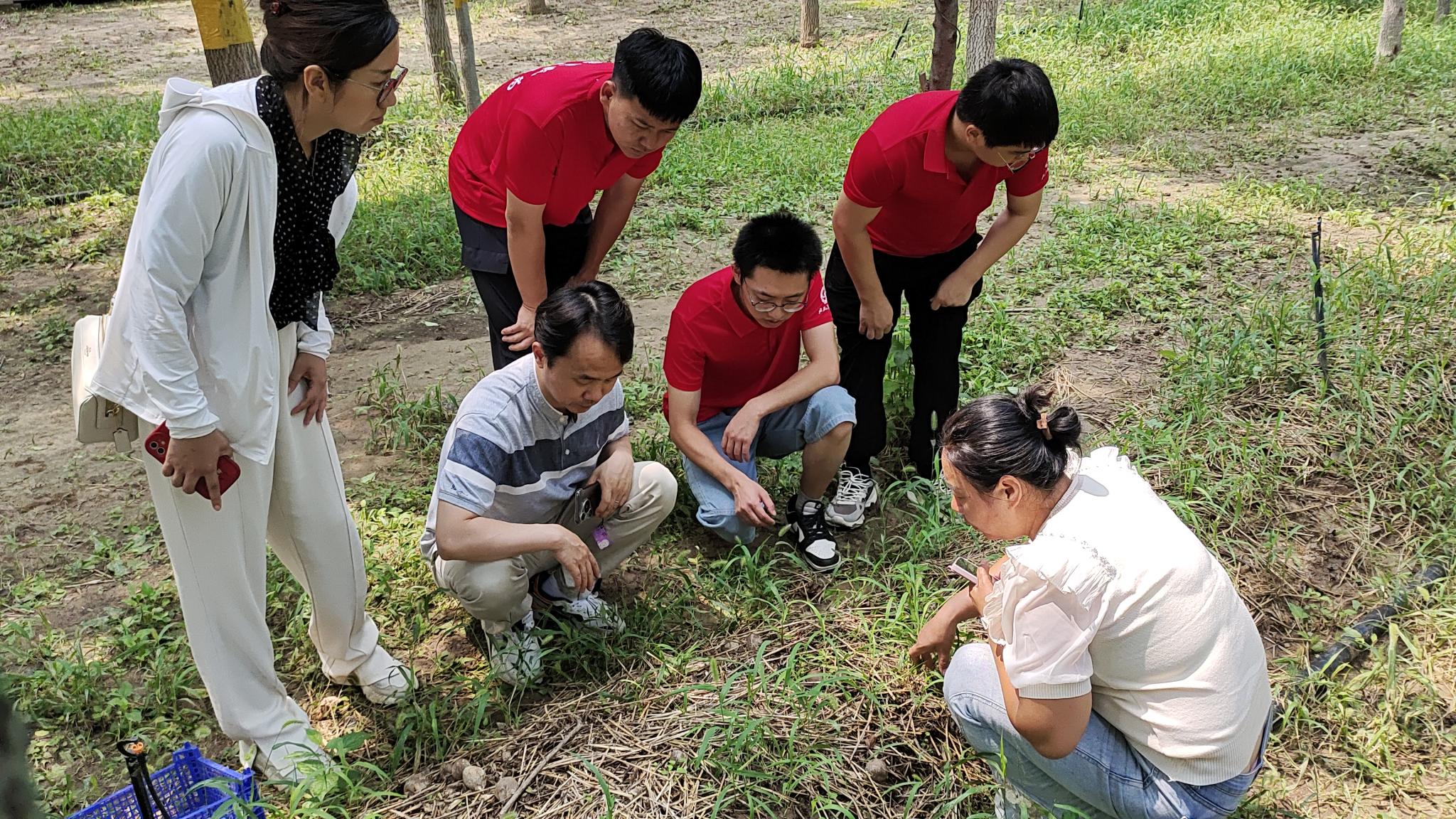 下午,实践团队抵达顺义区龙湾屯镇集体林场,调研林下栽培竹荪的情况。目前竹荪目前整体发菌良好、菌丝强壮,畦面已长出现原基和竹荪蛋。在调研过程中种植员问到“有部分任然没有出菇现象,是否就是失败不能要了”,随后实践团队老师用手直接扒开表面泥土,查看菌丝生长情况,回答到“这是正常现象,菌丝仍在生长,且状态良好,未出菇只是菌丝尚未长满,只要管理得当长满后是可以正常出菇的”,种植人员听到老师回答,瞬间就像吃了定心丸安心下来。