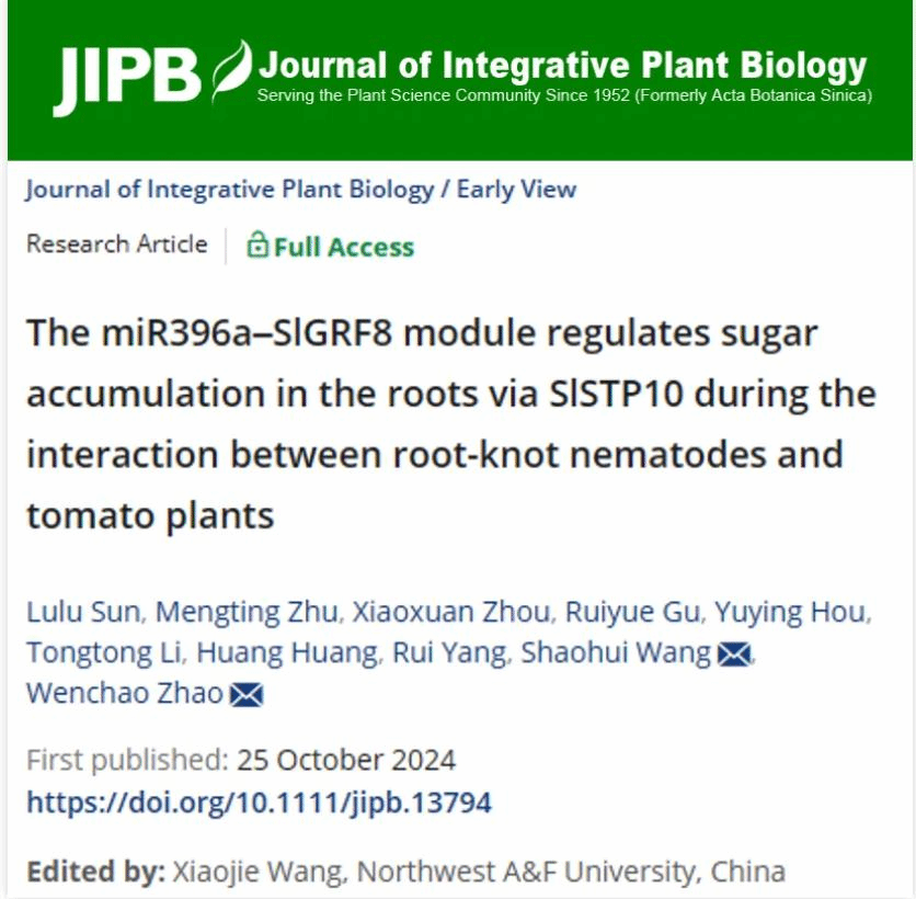 近日,JIPB在线发表了永利集团王绍辉/赵文超团队完成的题为“The miR396a-SlGRF8 module regulates sugar accumulation in the roots via SlSTP10 during the interaction between root-knot nematodes and tomato plants”的研究论文 (https://doi.org/10.1111/jipb.13794),该研究深入揭示了番茄与根结线虫相互作用中糖分竞争的分子机制,为探索植物-线虫互作机理奠定了坚实的理论基础。通过调控 miR396a-SlGRF8-SlSTP10 模块,可以有效调节番茄根系糖分分配,从而提高番茄对根结线虫的抗性,为线虫防治提供新的思路。