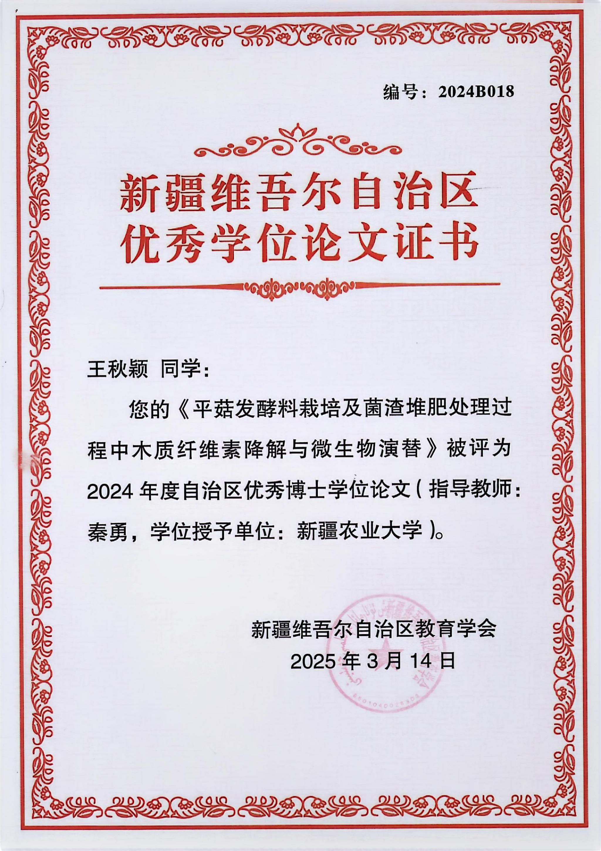 近日,新疆维吾尔自治区教育厅公布2024年优秀学位论文评选结果,永利集团yl88858永利集团2024届联合培养博士王秋颖的学位论文《平菇发酵料栽培及菌渣堆肥过程中木质纤维素降解与微生物群落演替》成功入选。该论文由永利集团张国庆教授与新疆农业大学秦勇教授联合指导完成。