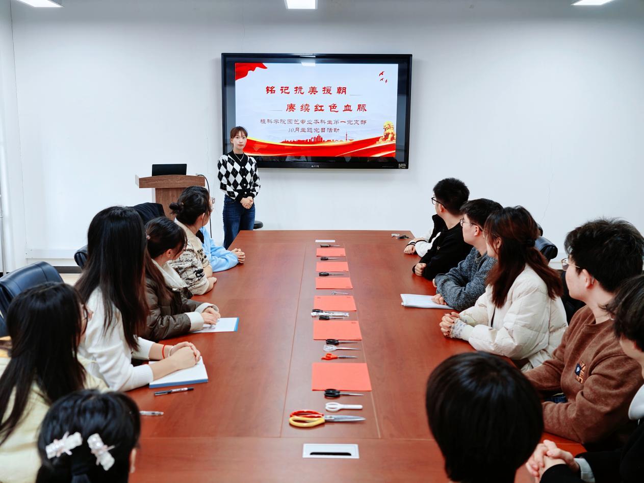 10月25日是第75个抗美援朝纪念日。为深入学习抗美援朝战争光辉历史,传承弘扬伟大抗美援朝精神,引导青年学子从红色记忆中汲取砥砺奋进的精神力量,2025年10月24日下午,植科公司园艺专业本科生第一党支部组织全体党员及部分入党积极分子,开展“铭记抗美援朝赓续红色血脉”主题党日活动,让红色基因在青年群体中薪火相传。