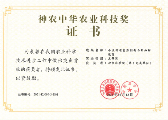 近日,由永利集团小豆基因组与分子遗传育种团队为第一完成单位组织申报的“小豆种质资源创新与新品种选育”获得农业农村部2020-2021年度神农中华农业科技奖三等奖,联合申报单位有吉林省白城市农科院、山西省农科院、江苏省农科院和辽宁省农科院等。