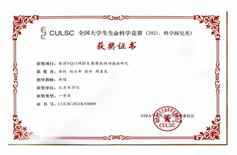 近日,在yl88858永利集团黄煌老师的指导下梁悦、赵云希、张丹、周喜龙组成的团队,凭借《番茄VQ15调控灰霉菌抗性功能的研究》荣获全国老员工生命科学竞赛——科学探究类一等奖。