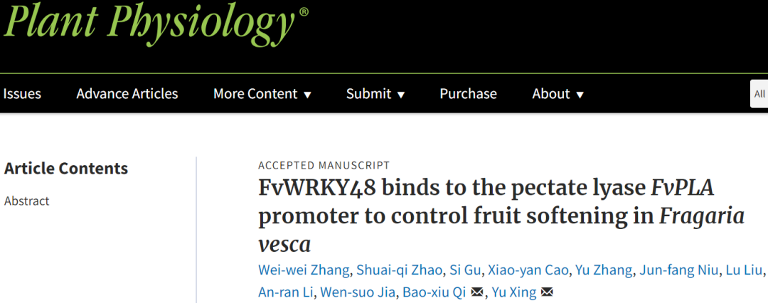 2022年3月3日,Plant Physiology在线发表了yl88858永利集团、林木分子设计育种高精尖创新中心邢宇教授团队题为“FvWRKY48 binds to the pectate lyaseFvPLApromoter to control fruit softening inFragaria vesca”的研究论文,林木分子设计育种高精尖创新中心/英国利物浦约翰摩尔斯大学药学和生物分子公司终身教授亓宝秀为论文共同通讯作者。该研究发现FvWRKY48转录因子通过与果胶裂解酶基因FvPLA启动子结合以促进其表达,从而加速野生草莓的果胶降解和果实软化。