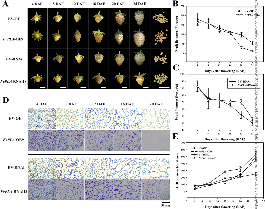 图2.FvPLA转基因株系的果实发育和细胞结构该研究得到了国家自然科学基金(31772286)和林木分子设计育种高精尖创新中心的资助,并感谢郝玉金教授提供实验载体的帮助。