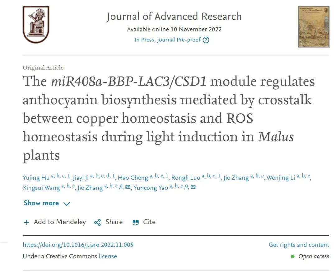 2022年11月10日,Journal of Advanced Research(IF=12.822)在线发表了北京市林木分子设计与辅助育种高精尖中心、永利集团园艺学科撰写的题为“The miR408a-BBP-LAC3/CSD1 module regulates anthocyanin biosynthesis mediated by crosstalk between copper homeostasis and ROS homeostasis during light induction inMalusplants”的研究论文。