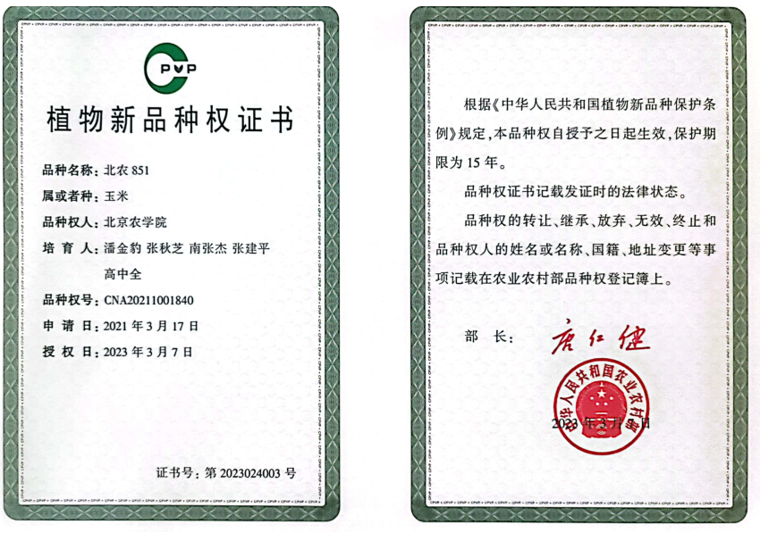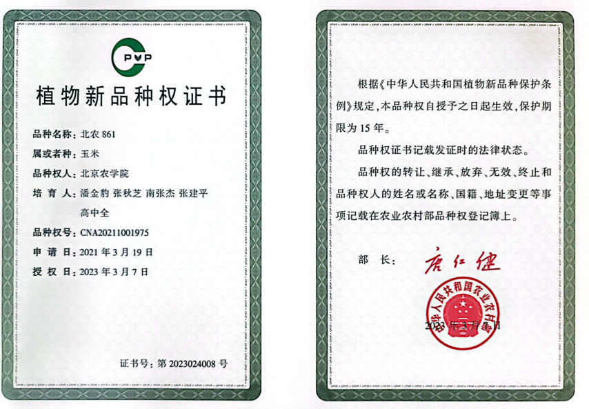 喜讯:yl88858永利集团青贮玉米团队:潘金豹、张秋芝、南张杰、张建平、高中全培育的玉米品种北农851 、北农861 取得国家植物新品种权证书。