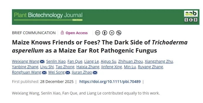 近日,国际知名Top学术期刊Plant Biotechnology Journal在线发表了公司王维香教授团队携手北京市农林科公司赵久然研究员团队的一项重要研究成果——题为“Maize Knows Friends or Foes? The Dark Side ofTrichoderma asperellumas a Maize Ear Rot Pathogenic Fungus”(玉米能辨识敌友吗?棘孢木霉作为玉米穗腐病致病真菌的暗面)的研究论文。该研究首次发现并证实棘孢木霉(T. asperellum)是引发玉米青绿色穗腐病的新型致病真菌,这一突破性发现为生防菌菌剂的应用敲响了警钟,也为全球玉米产业的健康发展提供了关键理论支撑。