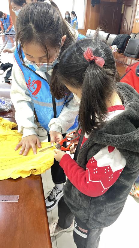 志愿者和小朋友一同进行旧衣改造,将孩子们带来的废旧衣服、纽扣等物品,通过设计制作成背包和手提包。为减少垃圾丢弃,保护生态环境,做到了绿色生活的第一步。