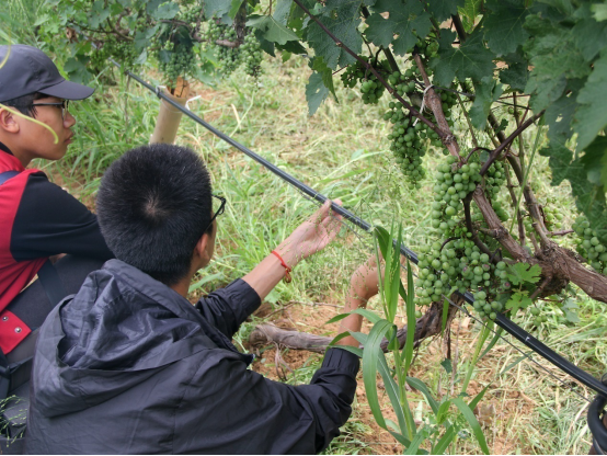 怀来作为中国古老的葡萄酒产区之一,至今已有上千年的葡萄种植历史。 怀来迦南酒业有限公司三处葡萄培育基地总面积为275公顷,种有二十多个具有不同适应性和表现的红白葡萄品种,同时也为国内提供优质葡萄嫁接苗。基地负责人陈经理热情的向北农植科实践团的员工们介绍葡萄基地的基本情况:葡萄基地处北纬40度的怀来,属温带半干旱季风气候,光照充足,昼夜温差大,十分适合葡萄的生长。“两山夹一湖”的独特地貌,强劲的季风不仅让葡萄藤免受雾霾和霜冻的影响,其带来的干燥空气也让葡萄园不易受到病虫害的侵袭。同时也陈经理也详细介绍了葡萄园精细化管理流程,严格把控葡萄园内的每一个环节,从葡萄抽枝、疏叶、绿色采收直至冬季埋枝等操作。