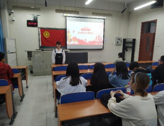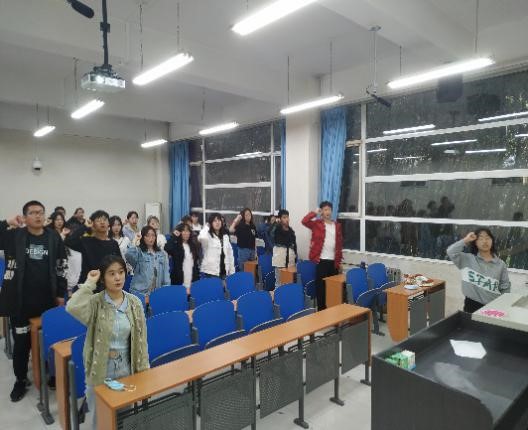 入团仪式伴随着庄严的国歌声拉开序幕。218232团支部书记李春燕宣读新入团成员名单并为新团员颁发团章、团员证、团徽,新团员期待已久的光荣时刻终于到来。教学楼B座104室的仪式现场,面向威武庄严的团旗,新入团成员与支部团员一起高举右手,紧握右拳,在领誓人赵雪的带领下进行宣誓:“我志愿加入中国共产主义青年团,坚决拥护中国共产党的领导.....吃苦在前,享受在后,为共产主义事业而奋斗……”。铮铮誓词点燃着同学们内心的激情,也让大家感受到了沉甸甸的责任。接下来,新团员杨清雅同学发言,表示会牢记入团誓词,并以实际行动践行誓言,争取成为新时代的优秀新青年。最后,优秀团员代表班卓就“如何做一名合格的共青团员”向大家分享了自己的见解,号召大家要牢记使命,脚踏实地,有一份热,发一份光,展现青春风采与使命担当。