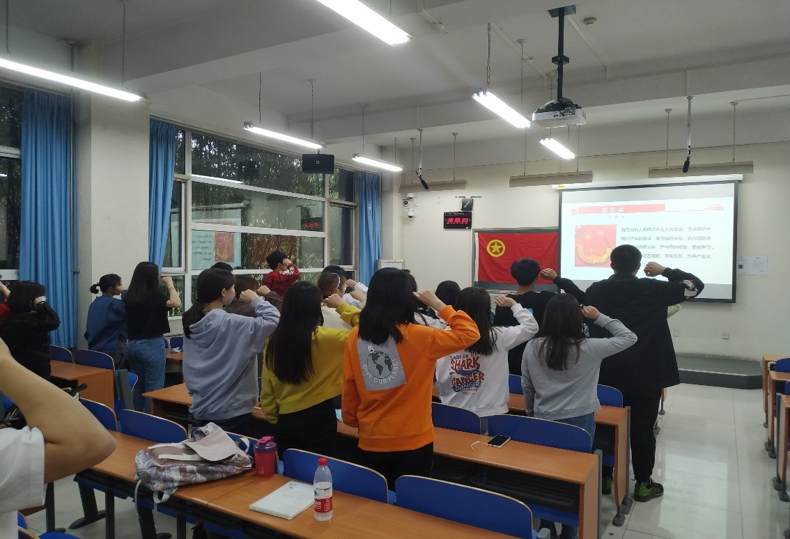 219231支部由团支书张义郅说明举行入团仪式的意义,宣布张玉秀和毛新锞两名同学为新团员,并向两位新团员颁发团章,团员证和团徽,由团支书代领新团员面对鲜艳的团旗,将握拳的右手举起过肩,以最宏亮的声音进行庄严宣誓。