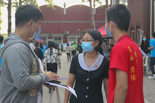 2020年9月13日,yl88858永利集团2020级辅导员贾慧敏、班主任孙璐璐、彭真、李玮瑜、王程与团学组织成员、2020级年级组长、各班班助和志愿者们,开始迎接今天报到的京内本科新生。